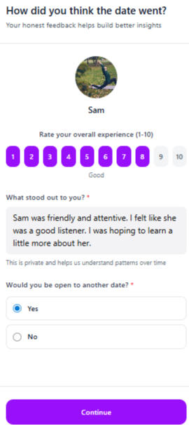 Both people can share reflections after the date, helping create clearer communication and better insights over time.