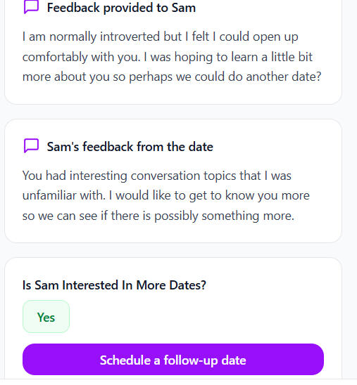 Both people can share reflections after the date, helping create clearer communication and better insights over time.