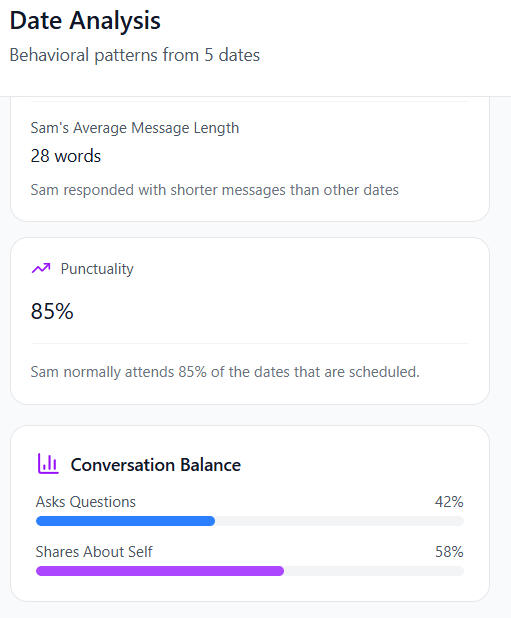 Stop overanalyzing every dating interaction.See patterns across your conversations, dates, and responses — and how they compare to others.